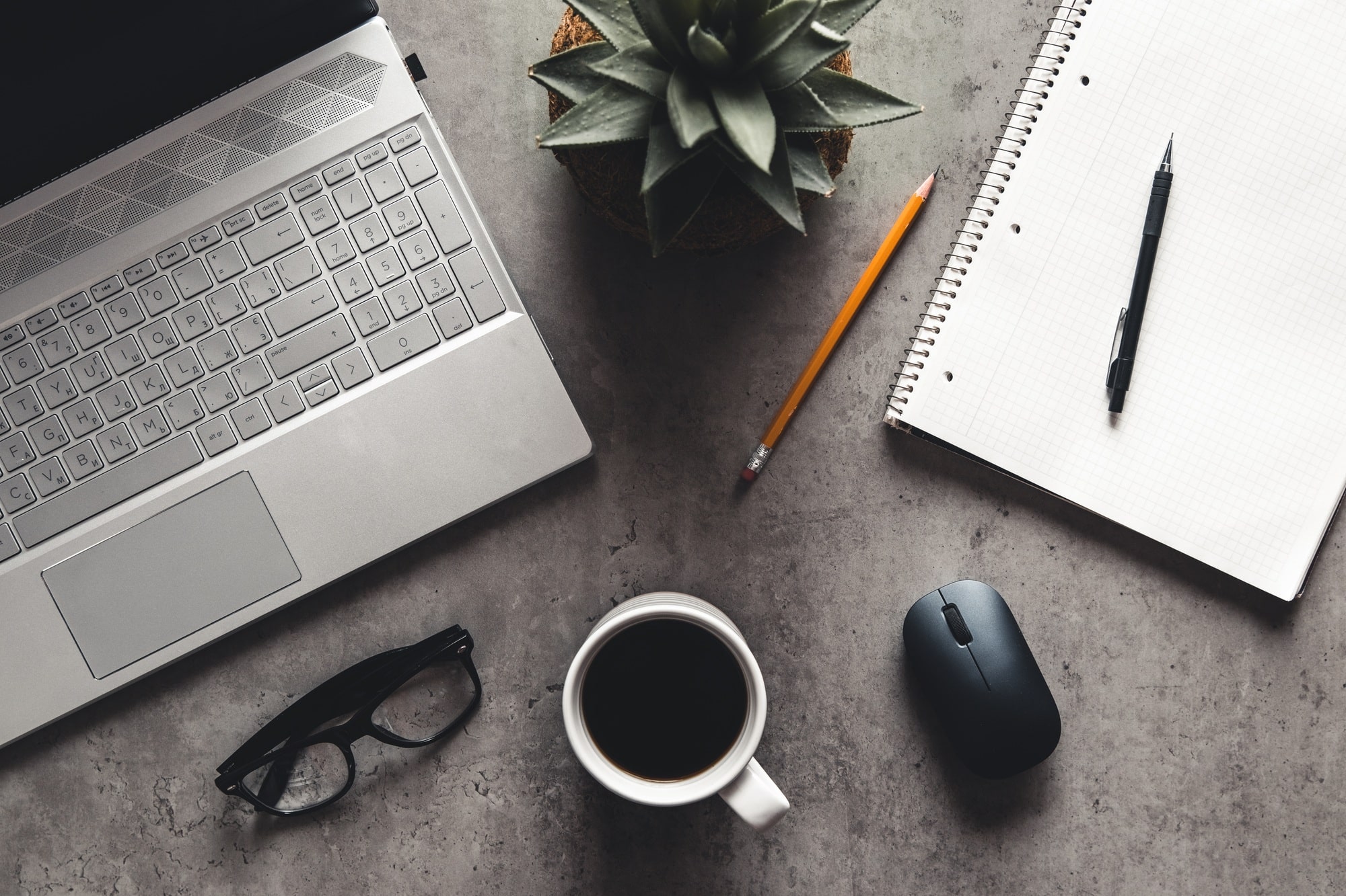 laptop and book, coffee on gray background, Top view of office desk on textured