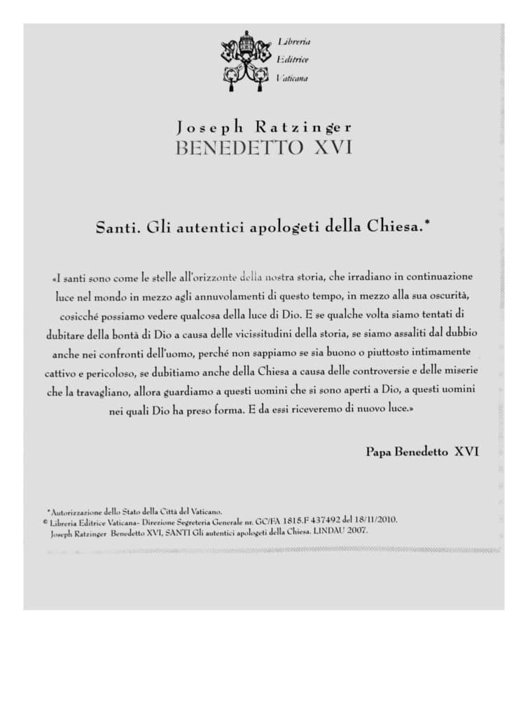 “I santi sono come le stelle all’orizzonte della nostra storia, che irradiano in continuazione luce nel mondo in mezzo agli annuvolamenti di questo tempo, in mezzo alla sua oscurità, cosicché possiamo vedere qualcosa della luce di Dio. E se qualche volta siamo tentati di dubitare della bontà di Dio a causa delle vicissitudini della storia, se siamo assaliti dal dubbio anche nei confronti dell’uomo, perché non sappiamo se sia buono o piuttosto intimamente cattivo e pericoloso, se dubitiamo anche della Chiesa a causa delle controversie e delle miserie che la travagliamo, allora guardiamo a questi uomini che si sono aperti a Dio, a questi uomini nei quali Dio ha preso forma. E da essi riceveremo di nuovo luce.”